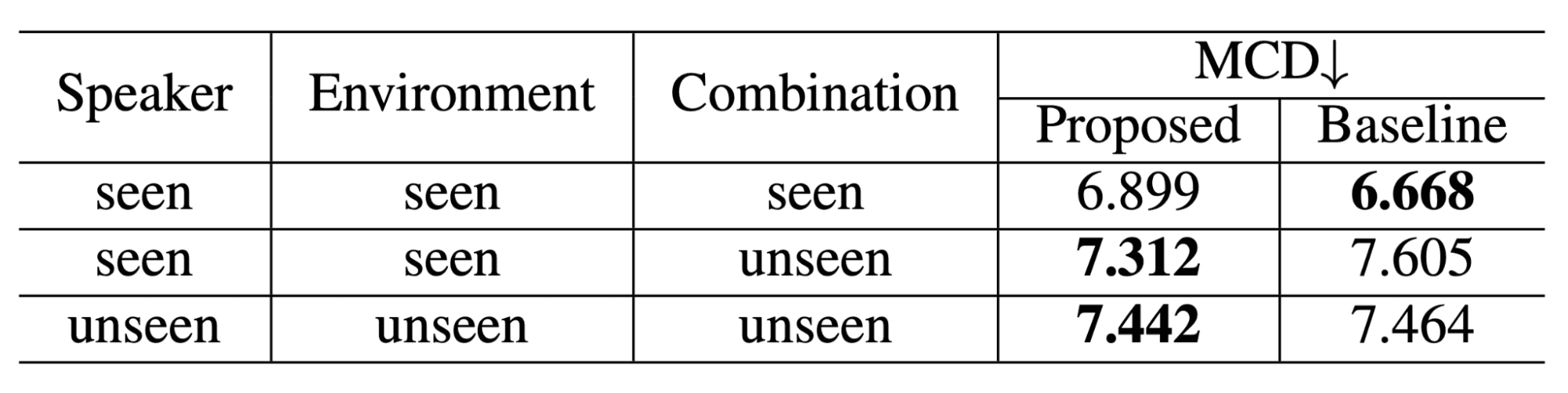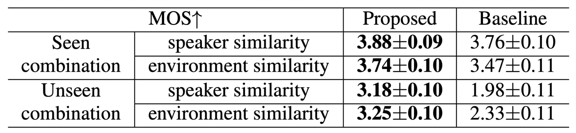 The results showed that Tan et al.'s proposed system wasn't as good as their baseline system at synthesizing voices it had already "heard" during training. Where Tan et al.'s proposed system excelled was in mixing voices and environments it had seen before in new ways, even creating speech for completely new voices and environments it hadn't trained on.