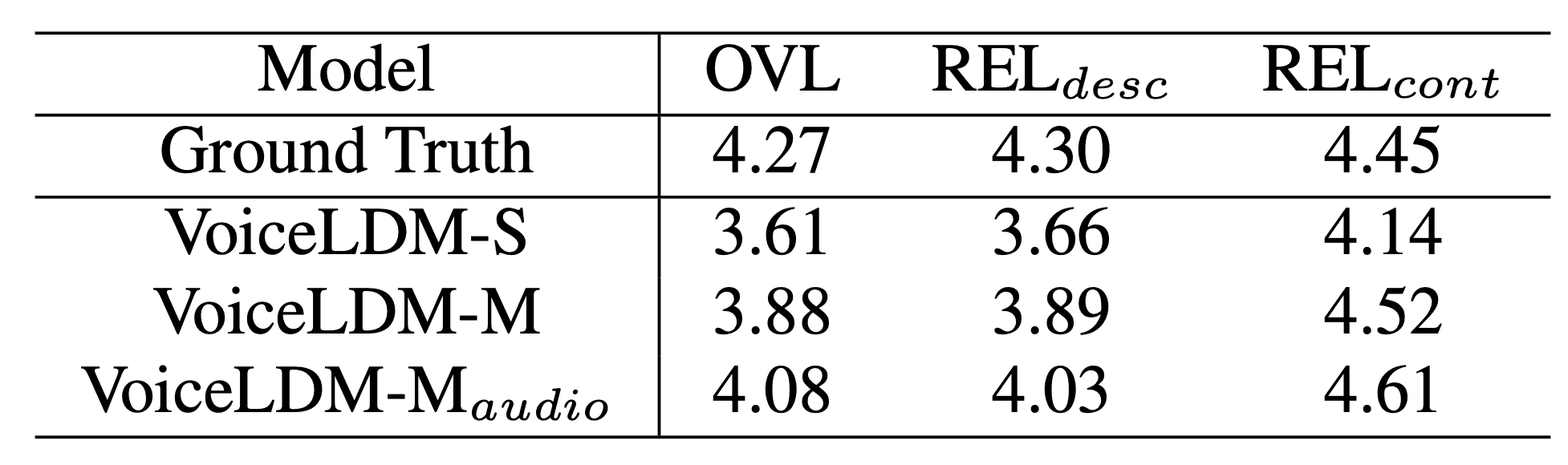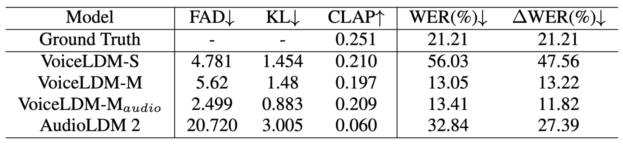 For this test, Lee et al. compared VoiceLDM's performance with AudioLDM2, another model that also allows user-specified speech or audio descriptions (but not at the same time like VoiceLDM). Below are the results: