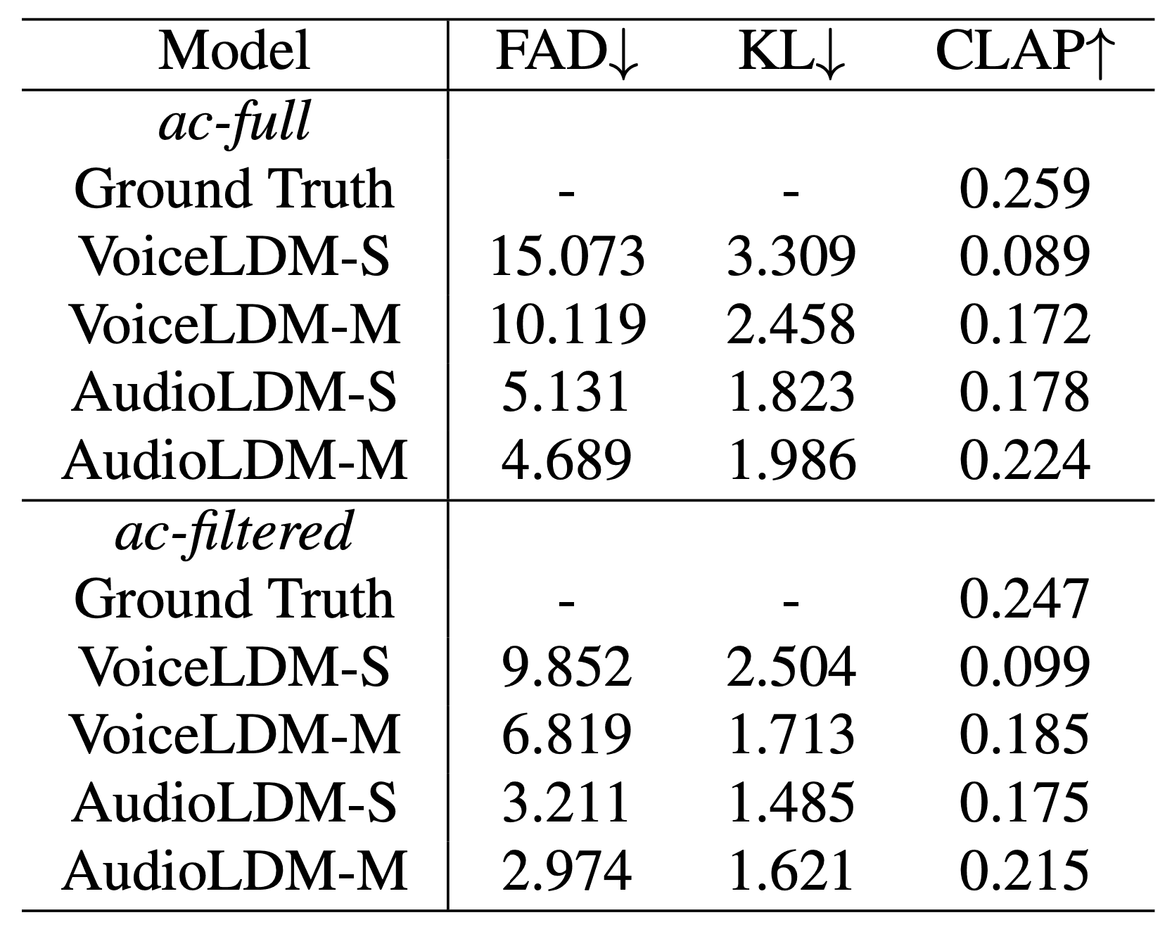 Across these tests, VoiceLDM-M and VoiceLDM-Maudio performed significantly better than AudioLDM2.