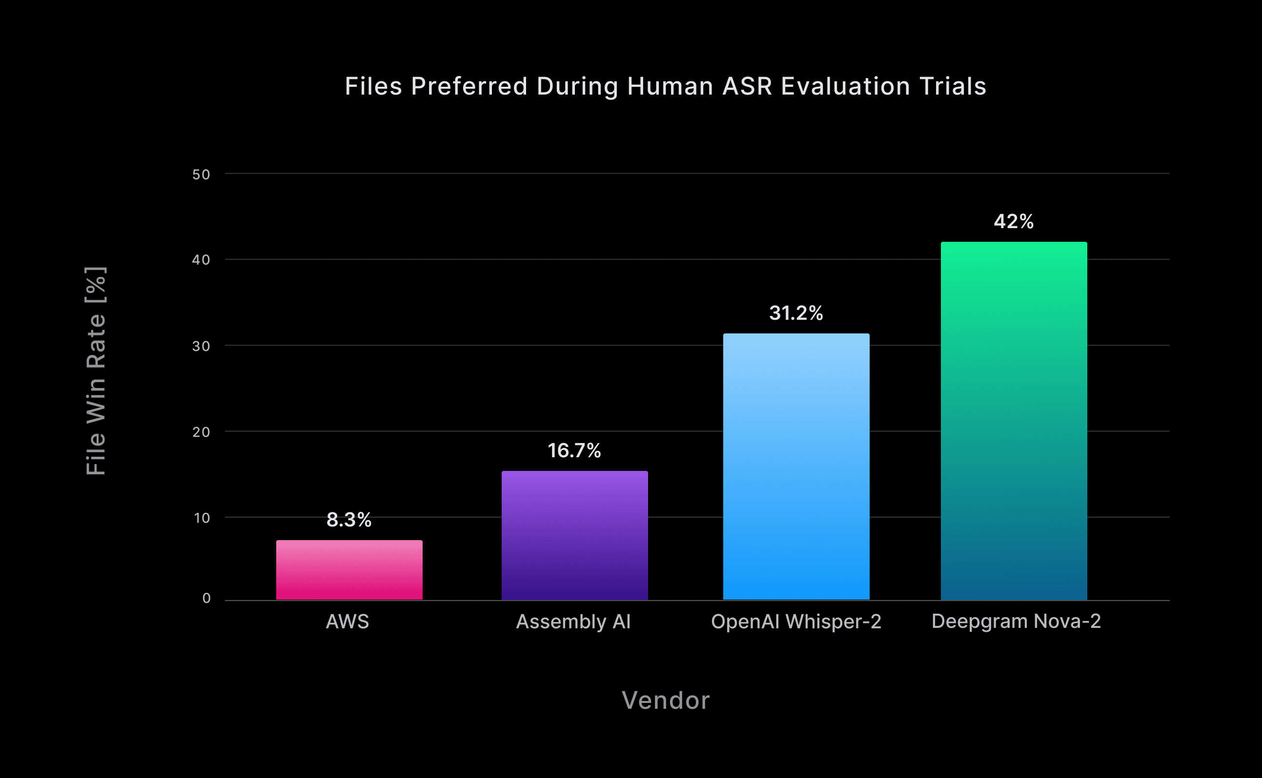 In head-to-head comparisons, transcripts generated by Nova-2 were preferred over the other vendors ~60% of the time, and 5 out of 6 annotators preferred formatted Nova-2 results more than any other STT vendor. Nova-2 had the highest overall win rate at 42%, which is a 34% higher win rate than the next best, OpenAI Whisper[2]. The overall win rates by vendor are shown in Fig. 3.