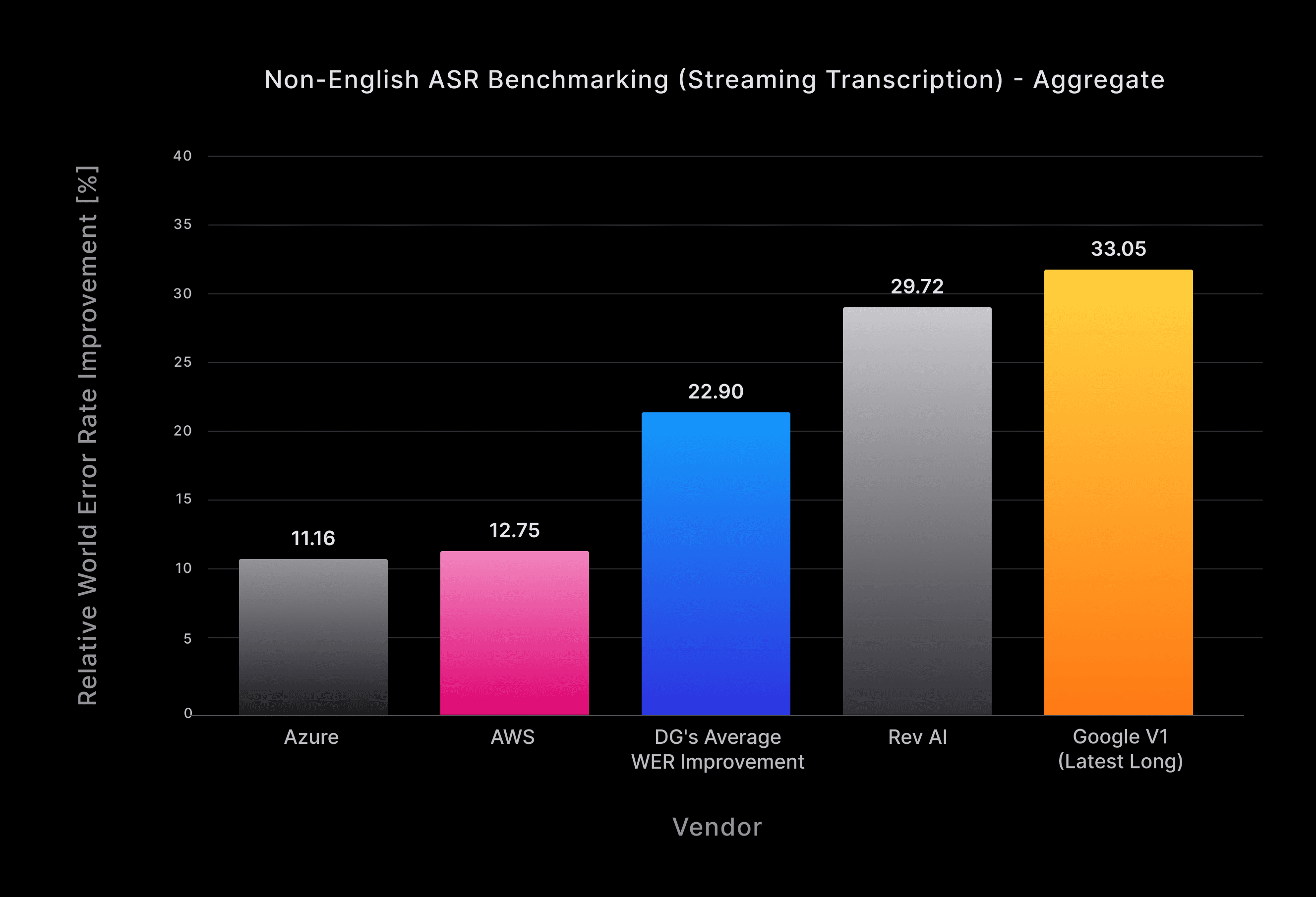 For non-English streaming, Nova-2 beats the competition by more than 2% in absolute WER over all languages combined with a 23% relative WER improvement on average (and 11% relative WER improvement over the next best alternative, Azure) as shown in Fig. 6. This advantage continues to grow in importance as contemporary voice applications–such as real-time agent assist and customer care voicebots–increasingly rely on instant transcription features to automate user interactions and provide superior customer experiences for multilingual end users.