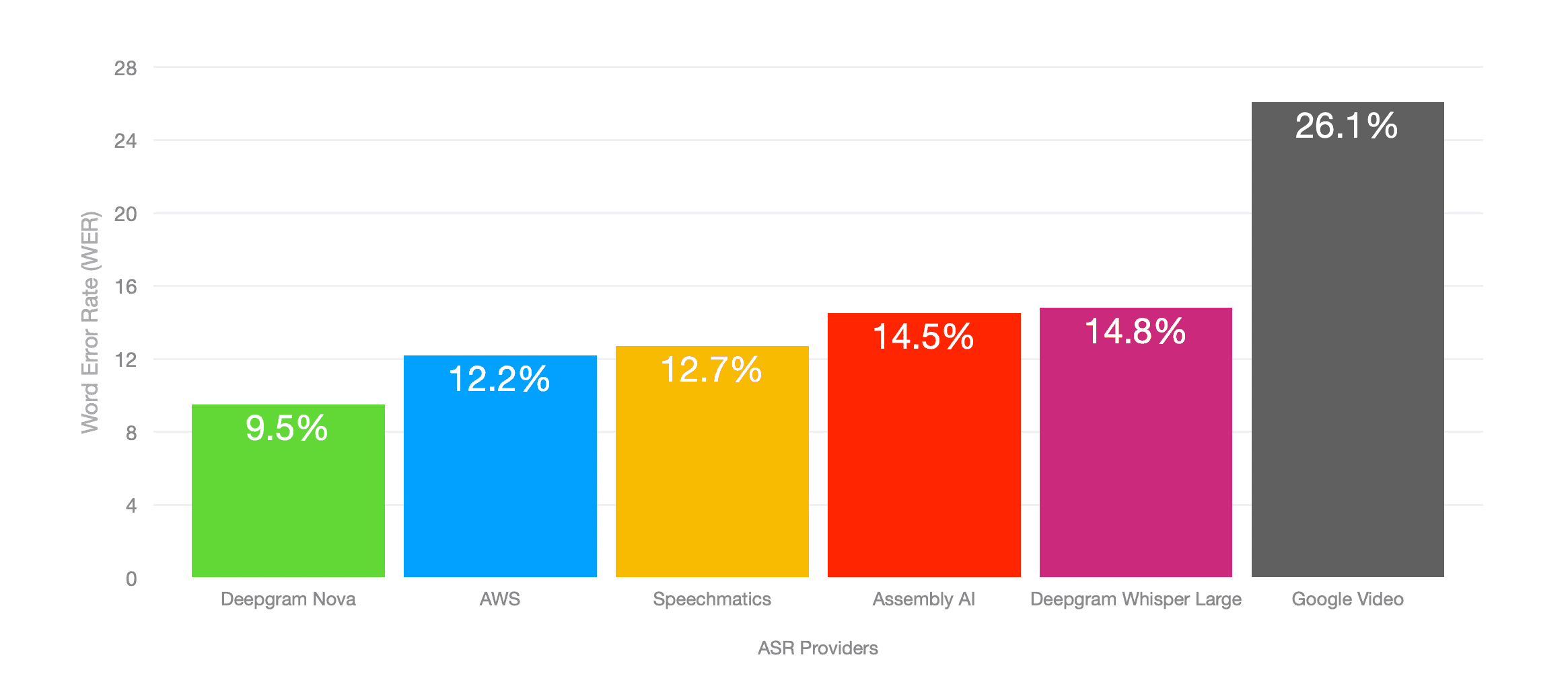 Using these datasets, we calculated Nova's Word Error Rate (WER)[1] and compared it to other prominent models. The results show Nova achieves an overall WER of 9.5% for the median files tested, representing a 22% lead over the nearest provider (see Figure 1).