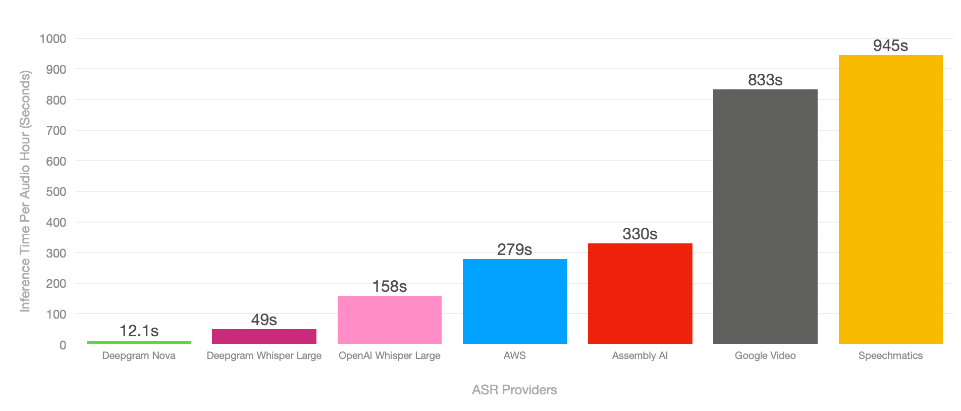 Figure 3: The median inference time per audio hour was determined using longer files, and diarization was included where applicable. To ensure a fair comparison, results are based on numerous trials of the same file for each vendor, giving them a fair opportunity to showcase their performance.