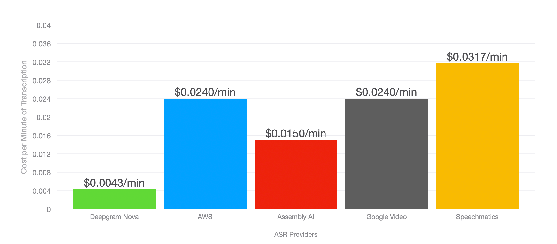 The best part? Our Deepgram Whisper "Large" model (OpenAI's large-v2) starts at only $0.0048/minute, making it ~20% more affordable than OpenAI's offering.